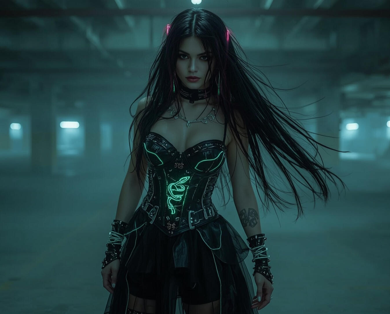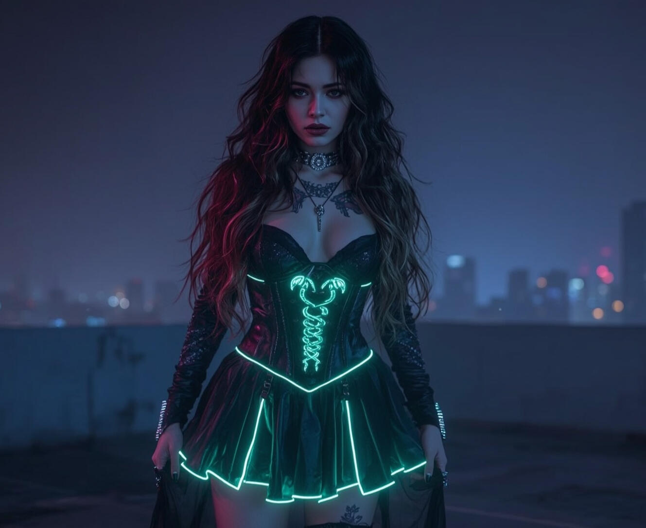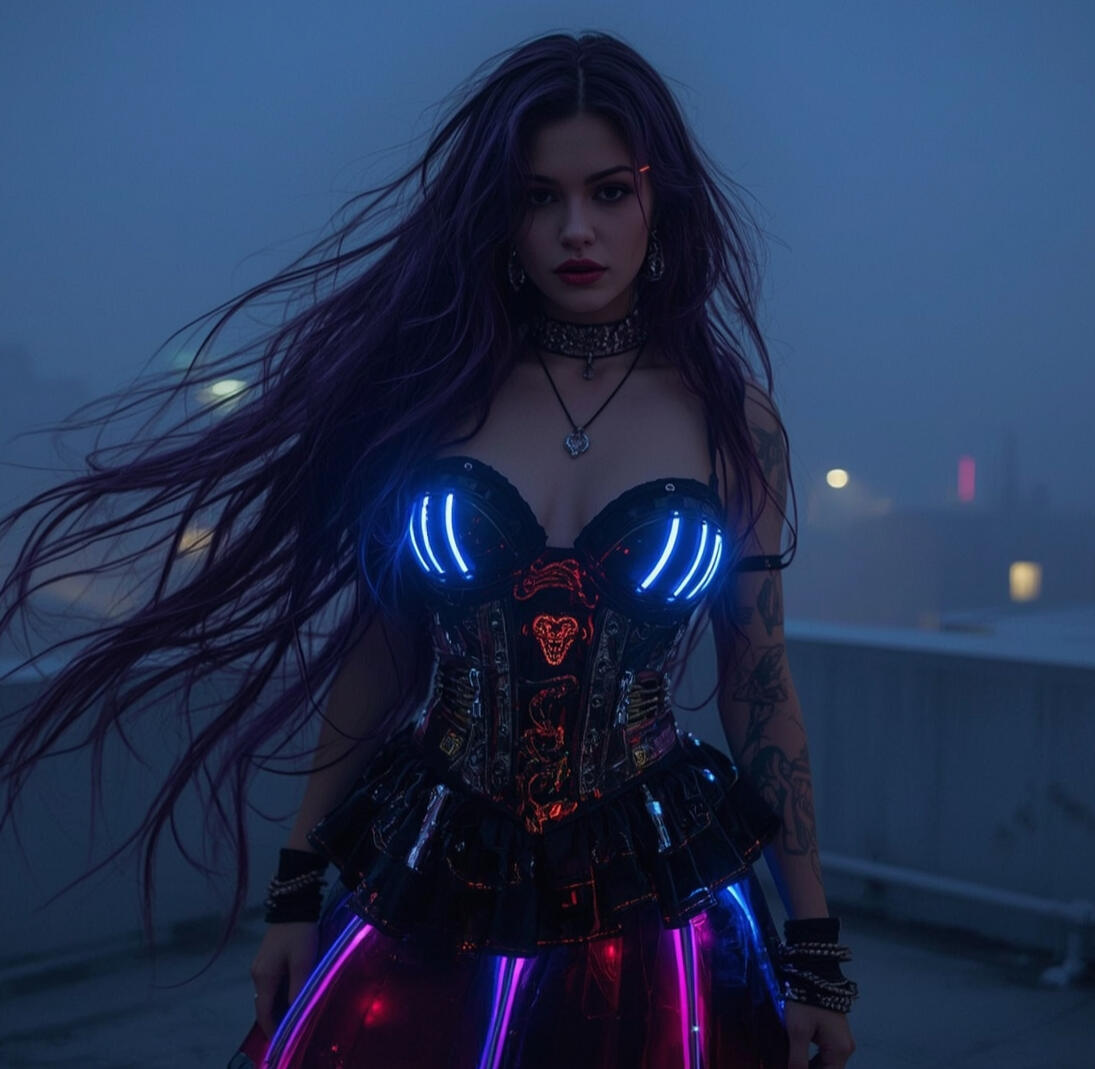 Their styling fuses goth culture with circuitry, neon, and industrial textures